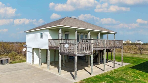 Downstairs you will find a charcoal barbecue grill, two picnic tables, and an outdoor sand shower. Crystal Beach Haus is a quiet place to make fun beach memories!