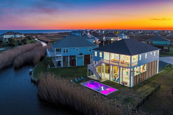 Enjoy your own private in-ground pool and spa, a custom tiki bar, outdoor dining areas, and a fenced backyard designed for gathering. Grill your fresh catch, dine under coastal skies, and unwind in a setting that blends comfort, space, and privacy.