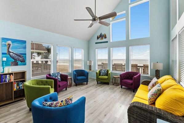 The outdoor entertainment at Shenanigans is second to none. Relax on the expansive deck and soak in the ocean views, or unwind in the private hot tub. The ground-level entertainment area is fully equipped with a bar, propane grill, bar stools, and picnic tables—all with unobstructed views of the Gulf.
