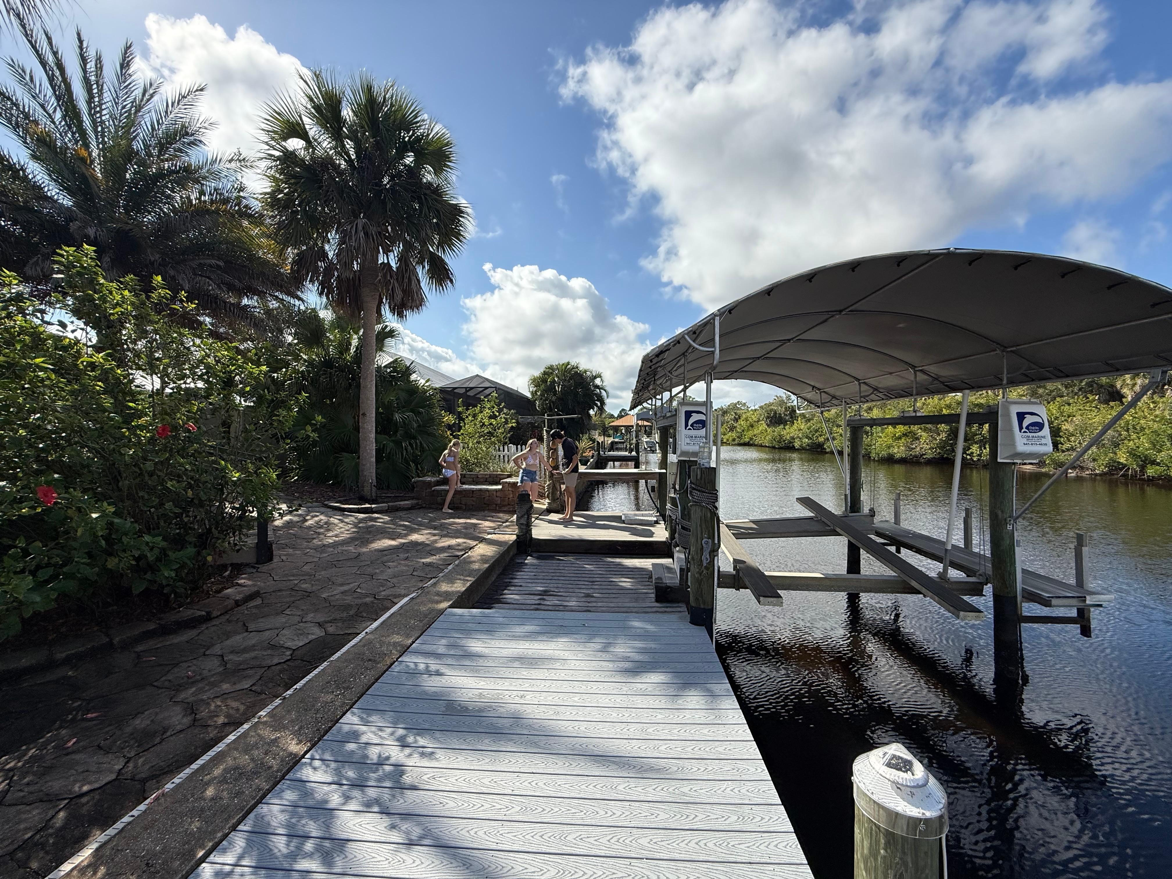 Step through the sliding glass doors to discover your outdoor paradise — a sparkling pool surrounded by comfortable seating and serene views of the canal. It's the perfect setting for lounging under the Florida sun or dining al fresco in the evening breeze. (Please note: the boat lift is not available for guest use.)