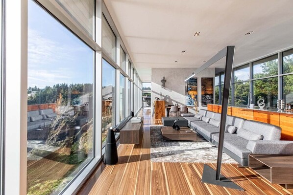 We stayed in this house for a week. It's an amazing house, set on a cliff top with wonderful views. It is well equipped with thoughtful inclusions and everything you would need for a great stay. Concierge service was prompt and efficient. A couple of things to note: The house is primarily glass and metal and so there are a lot of noises at night, and particularly when the wind blows. We did not mind this, but it would not be for everyone. You cannot open any windows and there are no internal doors (other than on the bathrooms), so any noise at one end of the house can be heard clearly at the other end. This may be a little awkward for 2 couples. The town is quiet and an easy walk away. If you like hiking, there are some great ones at this end of the Oregon Coast. We loved staying there and will no doubt be staying again.