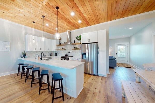 This gorgeous home boasts a sunny and airy open floor plan seamlessly combining the kitchen, living room, and dining area. The kitchen is complete with new appliances, including a wine refrigerator. There is plenty of counter space to work on, so put on the chef's apron and let your creativity flow! Then, once mealtime is over, gather in the living area to unwind and watch a favorite series on the large smart TV by utilizing your streaming login. This area offers comfortable sofas throughout. The back living area near the bunk room offers a second space for both kids and adults to relax, watch TV, read, and play games.