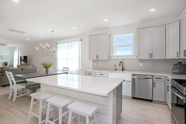 The kids will love their bedroom, which comes complete with a Pac-Man Pals Arcade game. This and the other bedroom is located on the second floor, each of which have access to a private bathroom and a TV. The two upstairs bedrooms have access to a covered deck with views of the gulf, bay, and pool.