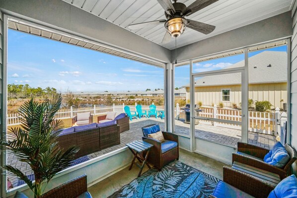 Step outside to enjoy the screened porch, perfect for morning coffee or evening wind-downs. The fenced backyard includes a private hot tub, smokeless Fire pit, Pellet grill, and outdoor seating for relaxed outdoor living. It’s a favorite spot for both adults and kids after beach days. Take the golf cart or bikes through the neighborhood to explore, dip in the pool, or grab a bite to eat.