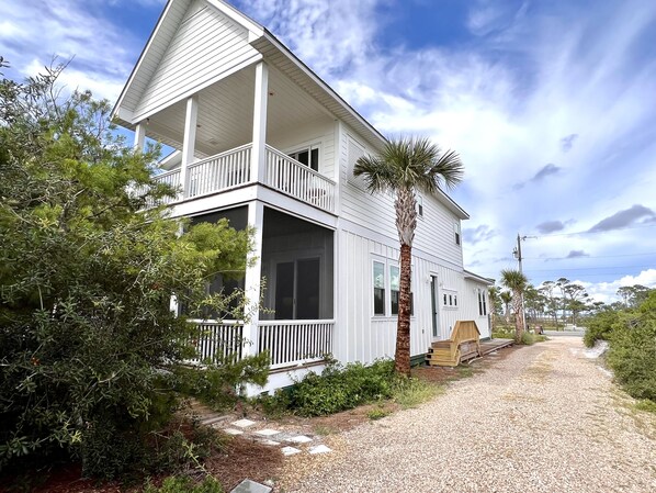 New pool installation for 2026 season. Welcome to Three Sea Stars, this gorgeous and newly built gulf view home that offers a spacious 4 bedrooms and 3.5 baths. Come enjoy a relaxing week with up to 12 of your closest friends and family while having all the comforts of home! This home offers two primary suites with one including its own private deck with gulf views. All bathrooms are designed with luxury tile showers or shower/tub combinations with clean coastal living décor. The kitchen is equipped with all possible amenities and offers upgrades such as granite counter tops and stainless-steel appliances. Spend time on the screened in deck and take in our breathtaking sunsets or relax around the fire pit under the stars. This home offers a short walk to our white sandy beaches and an outdoor shower to rinse away the fun in the sun.