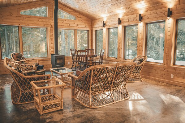 Newly added, is a gorgeous sunroom off the back with a wood stove and plenty of seating. This roomy sanctuary has large windows on three sides and gives a glorious view of the large trees and woody area behind the cabin.