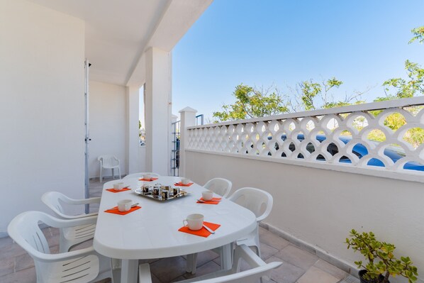 Your outdoor space includes a private garden where you can unwind, along with both covered and uncovered terraces that provide flexible options for dining and relaxation while enjoying the coastal scenery.