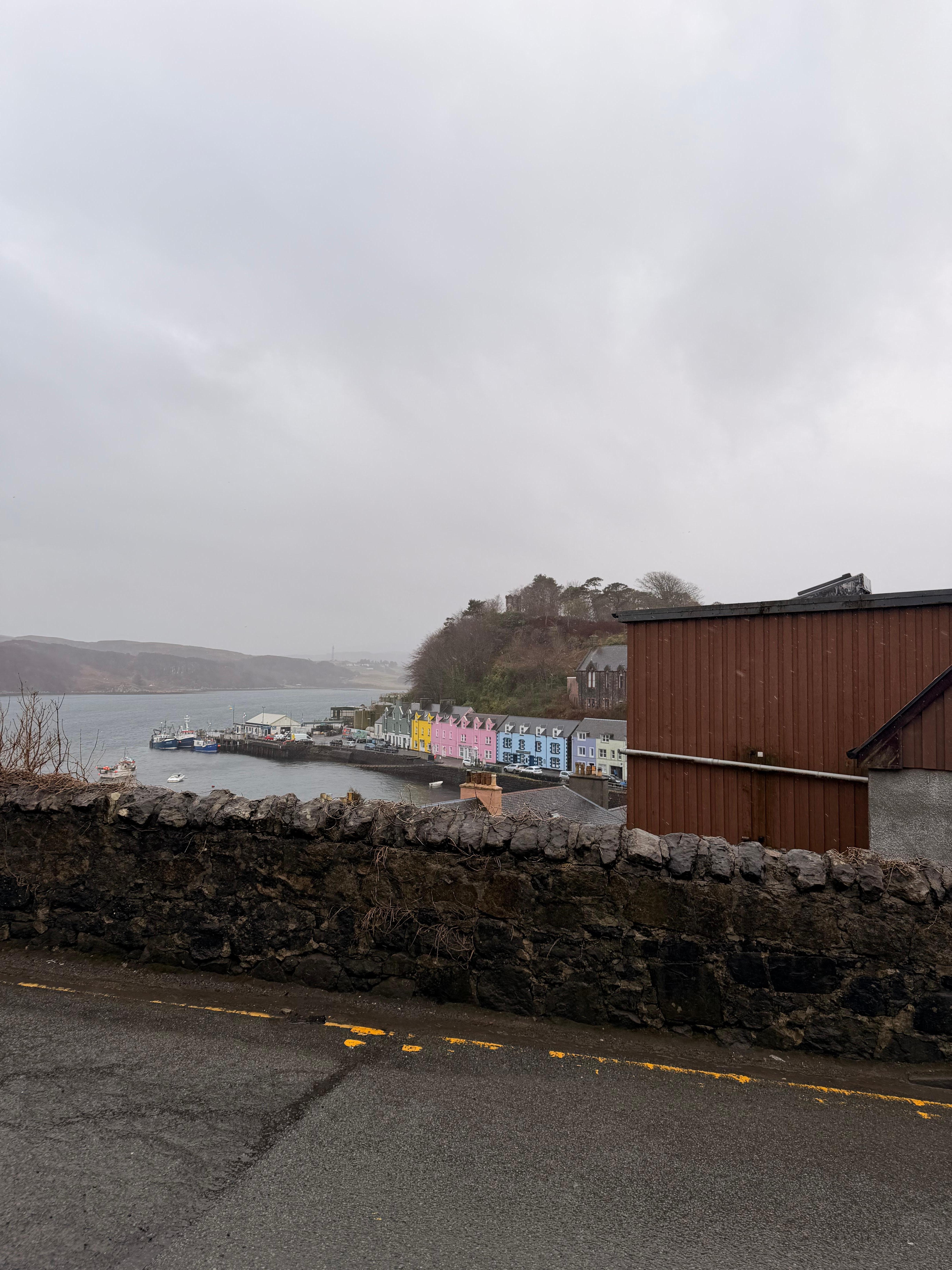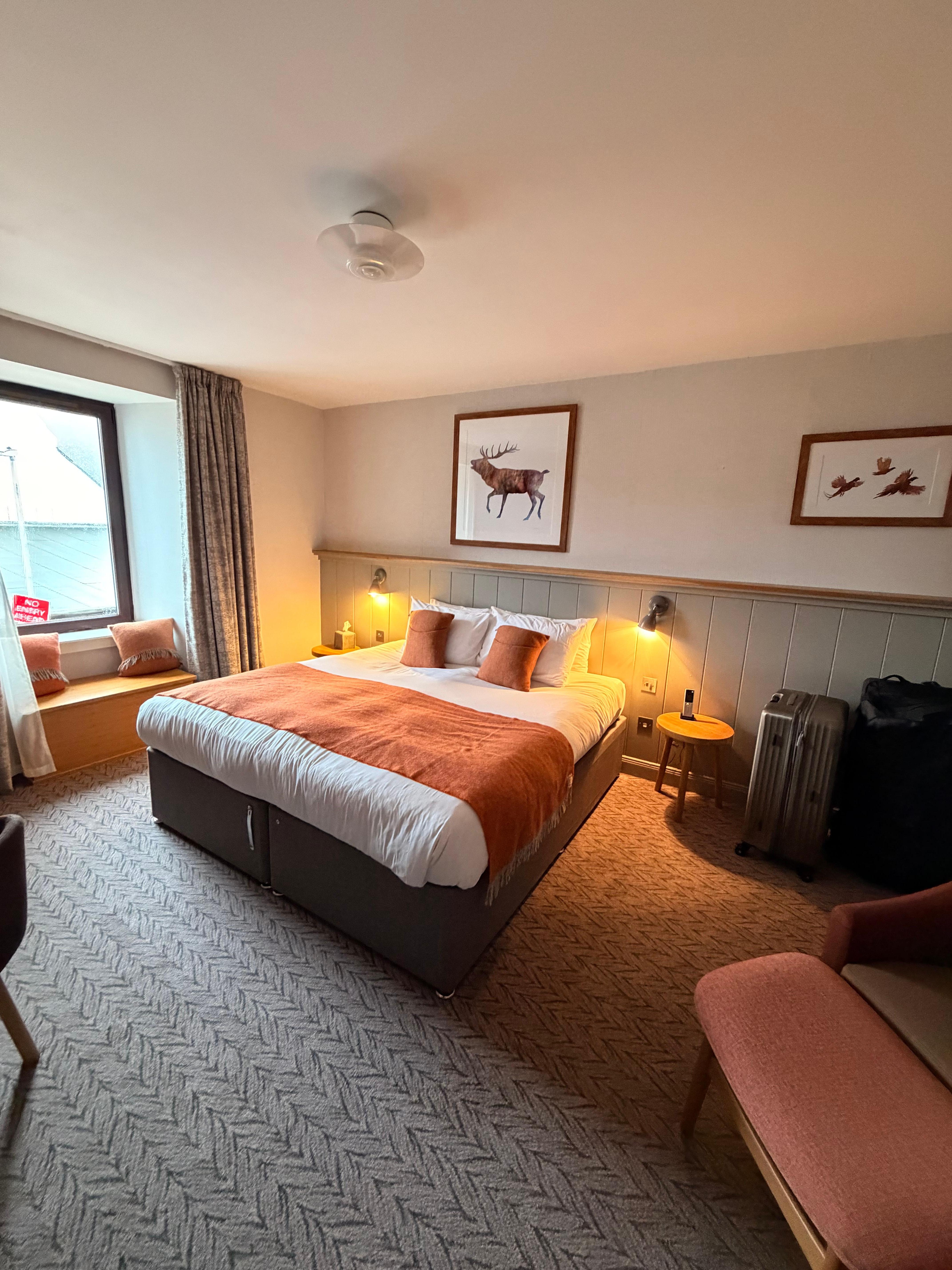 The room and common areas were very nice here and felt clean. We loved our room and the bed. Great bathroom and shower. The hotel does have a restaurant serving breakfast and dinner but we felt it was expensive. There’s obviously lots of cafes and trinket shops around in Portree. I will warn that there are only stairs here so big bags could be difficult or accessibility concerns. Parking is right in front if you are able to get a spot.