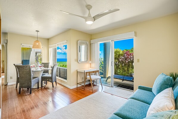 Experience the tropical splendor and serene beauty of Bali Hai at this comfortable, ground-level condo. This two-bedroom condo is located on the bluff at Pali Ke Kua in Princeville, on the beautiful North Shore of Kauai, perfect for a getaway with family or friends. The light and the bright kitchen come fully equipped for home cooking, with an adjacent dining area overlooking the ocean. The open living area welcomes casual downtime with comfortable seating and a smart TV. Ceiling fans are present throughout, and free WiFi and a private washer/dryer round out the in-home essentials. The home includes newly remodeled bathrooms, with new furnishings throughout.