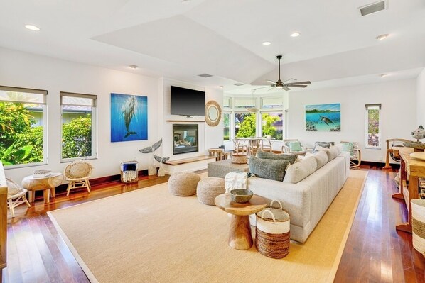Spacious living room includes a comfy sofa, board games, and game table with beautiful mountain views. Other features include laundry room, free high-speed WiFi and ergonomic work nook. Outdoor amenities include a beautiful backyard, patio area with lounge furniture, an outdoor kitchen, BBQ grill, beach essentials, sun loungers, a cozy front porch, onsite parking, and keyless access.