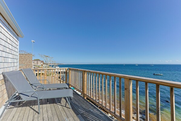 Located on Commercial Street in the heart of Provincetown, this cozy 3rd floor walk-up apartment was obviously just remodeled. Everything was up-to-date and immaculate. The ocean-front deck was a great place for a sunrise morning coffee and drinks after dinner. The beachfront below was also available for a swim or just to sit and watch the boats. Fantastic restaurants, great crowds and fun bars are all within walking distance. In fact I suggest ditching your car in paid overnight parking and getting around on foot. We had a wonderful time and recommend this property and host. We hope to return soon.