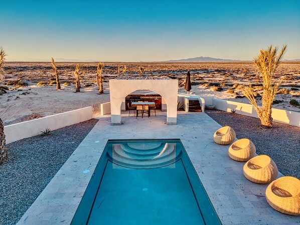 The expansive outdoor area features a private pool, barbecue grill, fire pit, outdoor shower, and half bathroom, perfect for entertaining or simply unwinding in the sun.