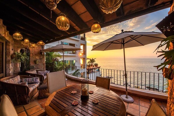 Kom opphold i vårt penthouse, innenfor en inngjerdet, sikker og bemannet 7 Unit Villa. Vi har en personlig engelsktalende concierge som vil plukke deg opp fra flyplassen og tilby å stoppe i supermarkedet din vei hjem for en USD40 avgift. Vi har 2 flotte store soverom, med aircondition og svært komfortable senger, hav og solnedgang utsikt fra hvert rom. Hver med fulle skap og dressers. Hvert rom på motsatte ender av enheten har sitt eget fulle bad. Baths Inkluder Blow Dryers, og håndklær, sjampo og balsam, tannkrem. Vi har den mest unike utendørs hav og solnedgang badekar / dusj. Stort moderne kjøkken med nye Onyx vasker og nystøpte betongmålere, kjøkken inkluderer kjøleskap, mikrobølgeovn, kaffetrakter, komfyr, stekeovn, gryter og panner, brødrister ovn, blender, tallerkener, sølvtøy Sting, bordduker og servietter. Vakkert innredet romantisk stue og spisestue er full av tradisjonell meksikansk kunstverk. Ekstra stor overbygd terrasse med full hav og solnedgang er møblert og elegant innredet med dimmere innsiden av utsmykkede glass lanterner, håndlagde puter, 2 paraplyer for skygge, dusinvis av tropiske potteplanter, og en utendørs fan. Privat vaskerom og husholderske er inkludert 3 dager per uke. Vi har en eksklusiv i massasjeterapeut og massasjebord, alle oppsett og klar for deg. Vi har høye bjelkelofter, glass i glass, tropiske trebeskyttede dører og vinduer som kan åpnes for å få hele enheten til å føle seg åpen! Vi har AppleTV, Dvd-spillere, Trådløst høyhastighetsinternett, Fasttelefon for lokale samtaler, Ipod Docking Station, Høyttalere, Pool Floaties, Bassenghåndklær, Strandleker, Snorkelutstyr, Spill og Bøker. Stranden ligger like utenfor vår port og skritt unna, The Villa Pool for din bekvemmelighet har et kjøleskap, svømme opp bar og bad. Det er 2 restauranter og en fabelaktig cocktailsalong høyre nabohuset, byen ligger kun få minutter unna. Drosjer kan piske deg inn i byen for rundt $ 4 og bussen stopper rett foran villaen. I PV har du muligheten til å spise i verdensklasse restauranter, se live teater, dans natten bort, gå på Malecon (Boardwalk), og opplev Street Performers og offentlig underholdning overalt! Du kan handle i ditt hjerte s innhold, besøke mange kunstgallerier og håndlagde spesialbutikker.