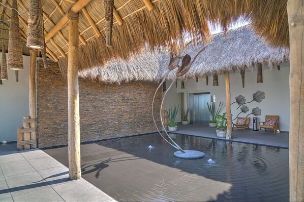 Nayri Life and Spa focuses on its common areas. The development has a large common area terrace complete with two pools overlooking the ocean, gym, two BBQ's, multiple rest areas and a spa area complete with sauna, steam room and showers with spa services upon request. Start the day with a massage or facial, you don't even need to leave the building to be pampered. The lobby is impressive with a gigantic table made from a single piece of parota. There is 24/Hr security personnel on site and there are security cameras in the common areas.