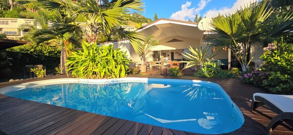 Villa Malya has everything you and your family need. From a beautiful fresh pool facing the ocean and Moorea Island to a large covered terrace welcoming a pool table and a table football.