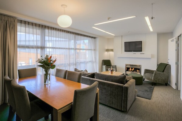 Open plan living area, with dining table