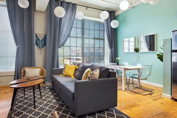 *Important Note: This rental is located in a historic tobacco warehouse that has been converted into residential apartments but still maintains older warehouse fixtures. The walls for the bedrooms do not reach the 22 foot ceiling, this can be seen in the pictures. Also, since this is an industrial setting, some noise does carry from surrounding neighbors. The parking is not on the ground level of the building, but rather 1 block away. Let us know if you have any further questions about these notes!