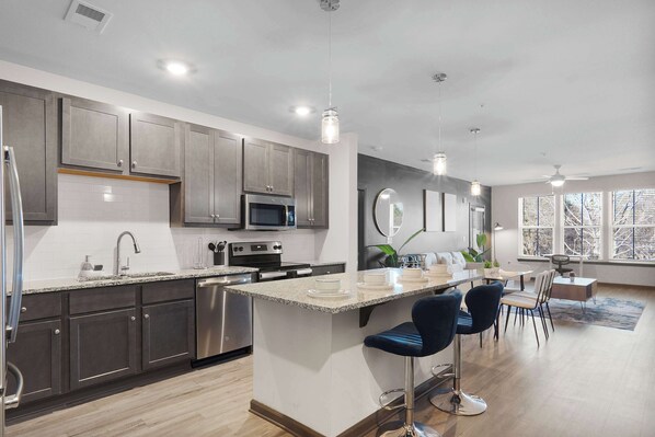 Refrigerator, oven, stove, microwave, dishwasher, Coffee and tea station (coffee, tea, sugar, creamer), Pots, pans, utensils, knife set, cutting board, Plates, bowls, cups (starter set), Blender, toaster, trash bags, dishwasher and laundry pods.
