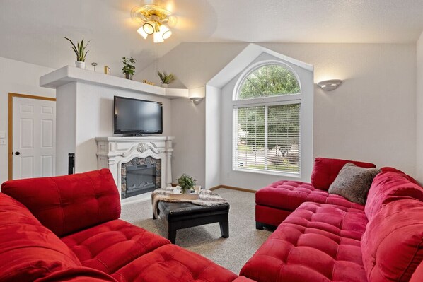 Relax in the main living room with comfy seating, a large TV, and an electric fireplace. Big front windows bring in natural light and a view of the quiet street and mature tree out front.