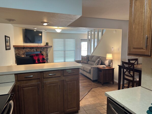 Grandview #7 is a 2 bedroom, 1.5 bathroom townhouse located on the east end of town, but is within walking distance to adorable shops and restaurants. The front door opens to an open floor plan of the main living area, dining room, and fully equipped kitchen. You will find a wood burning fireplace (firewood provided in the winter months, beginning Dec 1st) in the living room and TV. The property does have high-speed internet. There is a ½ bathroom also on the first floor.