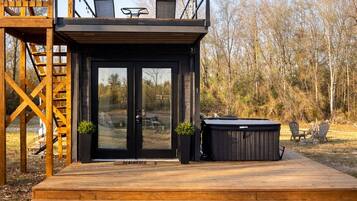 Tiny house with hot tub, kids play area, and fire pit