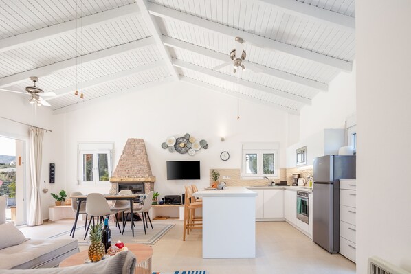 Open plan fully equipped kitchen, Kitchen island, dining table, and corner sofa.