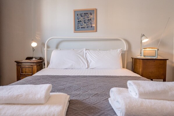 There’s a dining table with a couple of chairs and a wonderful mix of retro furnishings including a dresser stacked with crockery, cutlery and glassware for your use; a sofa, couple of chairs and coffee table; a TV and DVD player with a selection of DVDs for you to choose from in a 2nd dresser; and a coat/hat stand conveniently waiting for you by the door.