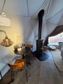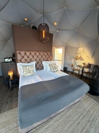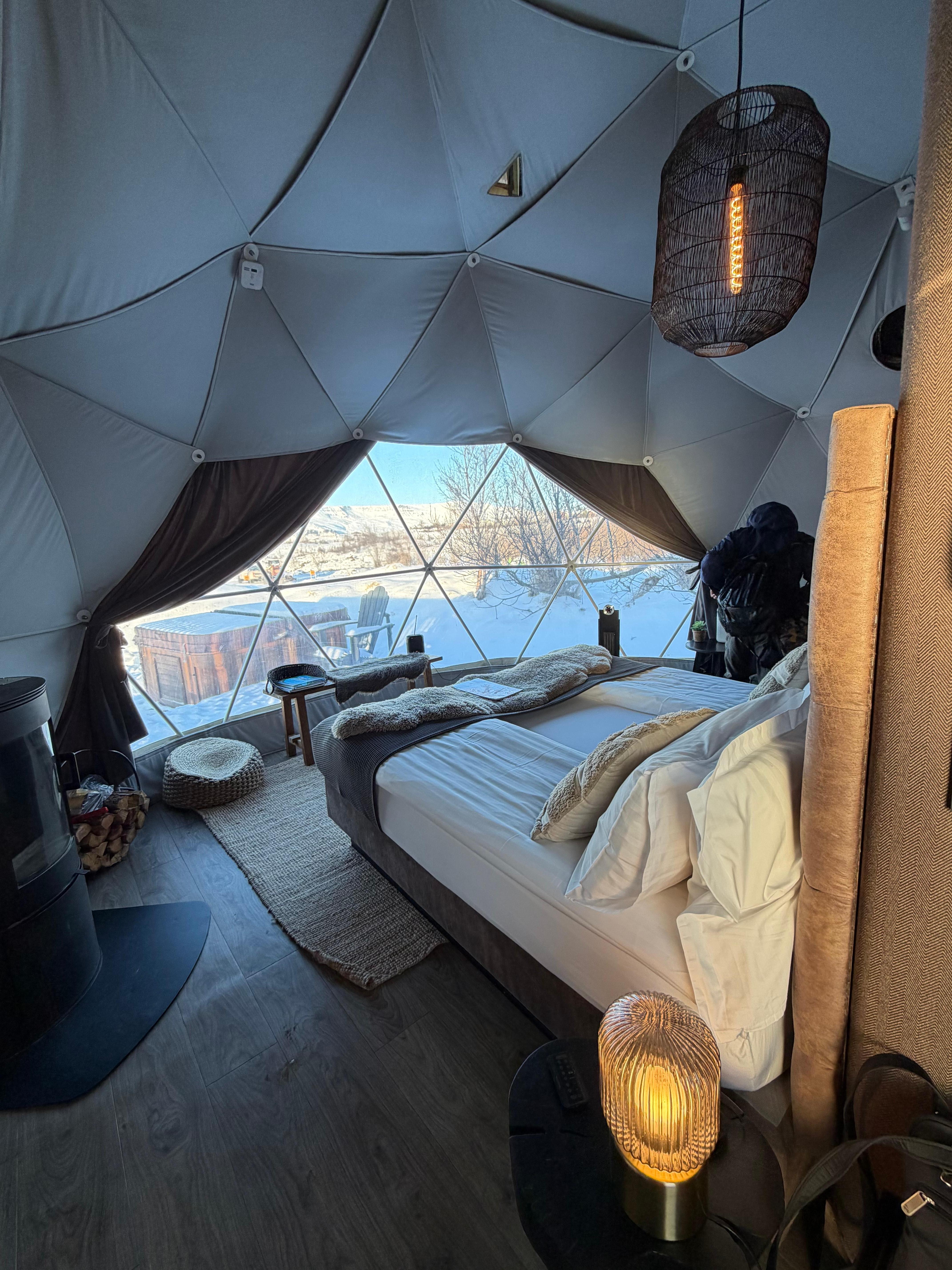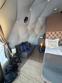 Mountain view(some construction going on off to the side). Slight traffic and snow plows through the night on nearby road. The Dome inside was beautiful and peaceful with everything you need. Hot tub right outside. Robes and slippers supplied. Coffee and tea in the room with coffee maker and electric hot water kettle. Radio, multiple heaters and wood stove. Great WiFi. Board games. Heated towel rack and fully stocked bathroom in private bathroom inside the Dome. Food delivery available directly to your Dome from nearby places such as Dominoes Pizza. We ordered the breakfast package with our stay and received more than enough for two or more people with a variety of items. The staff was more than helpful in answering questions. This was a wonderful experience and we would absolutely stay again.
