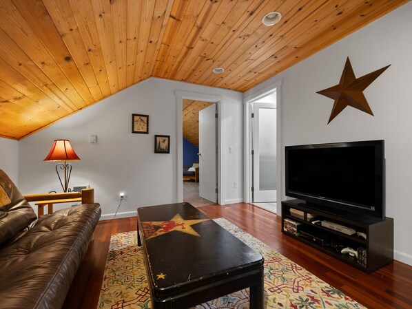 Enjoy complimentary Wi-Fi, a cozy wood stove with firewood, and a private deck with a barbecue grill. The workshop offers convenient storage, basketball, and pickleball. Ample on-site parking is available, and self check-in is easy with a smart lock.