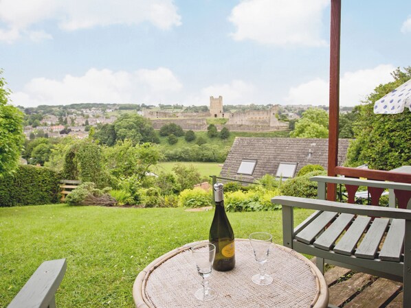 . Dette frittliggende feriehuset kombinerer moderne bekvemmelighet med designstil og malerier av en lokal kunstner, som ligger 2 miles fra Yorkshire Dales National Park, og befaler omfattende utsikt over historisk Richmond til slottet, elven Swale og gamle dype felter. I en forhøyet posisjon inviterer sine fredelige hager gjester til å beundre utsikten. Richmond, med sin livlige markedsplass og teater, er inngangsporten til Dales. York, Ripon og Harrogate ligger innen 1 times kjøring. Butikker ½ kilometer, real ale pub og restaurant 200 meter.