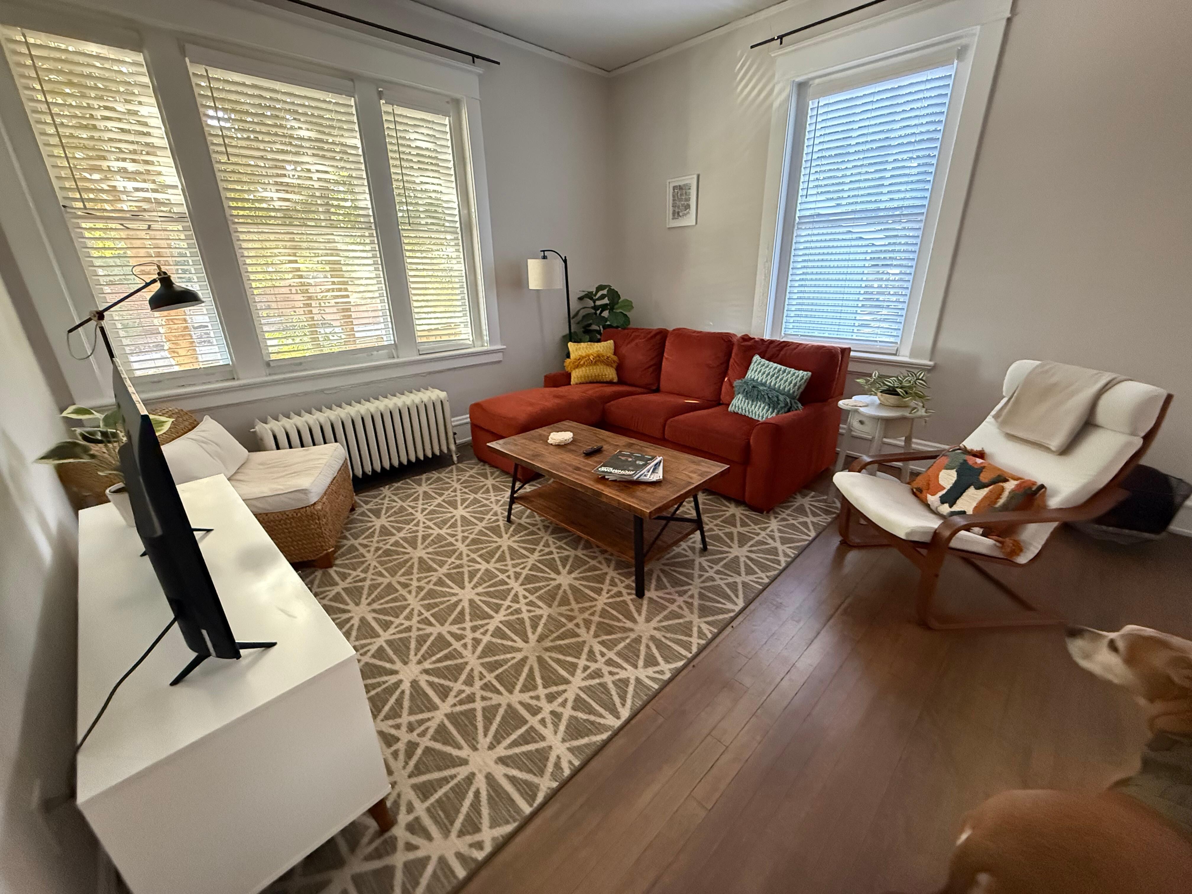 The apartment is on the first floor of a two level 1920s duplex in a quiet historical neighborhood of Richmond. The apartment has an open floor plan with a full kitchen, including a stove, full sized refrigerator, microwave and coffee maker. Between the kitchen and the living room is an open area with a small table and chairs. The bathroom and bedroom are located off of the main living space. The bathroom has been completely renovated with a walk-in tiled shower and brand new fixtures. The bedroom has a queen size bed and a hanging space for clothes. The apartment has a newly installed central AC and heat which is controlled independently from the rest of the house as well as radiator heat.