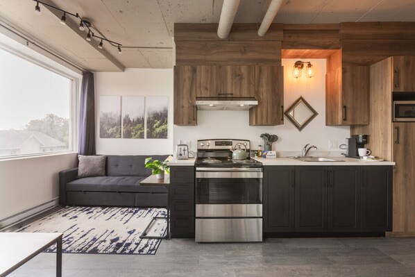 Lofts Orizon offers you this brand-new 400-square-foot loft in the heart of downtown, a true gem combining simplicity and modernity. Featuring a spacious rooftop terrace, this space is the ideal place to relax, with a breathtaking view of the St. Lawrence River.