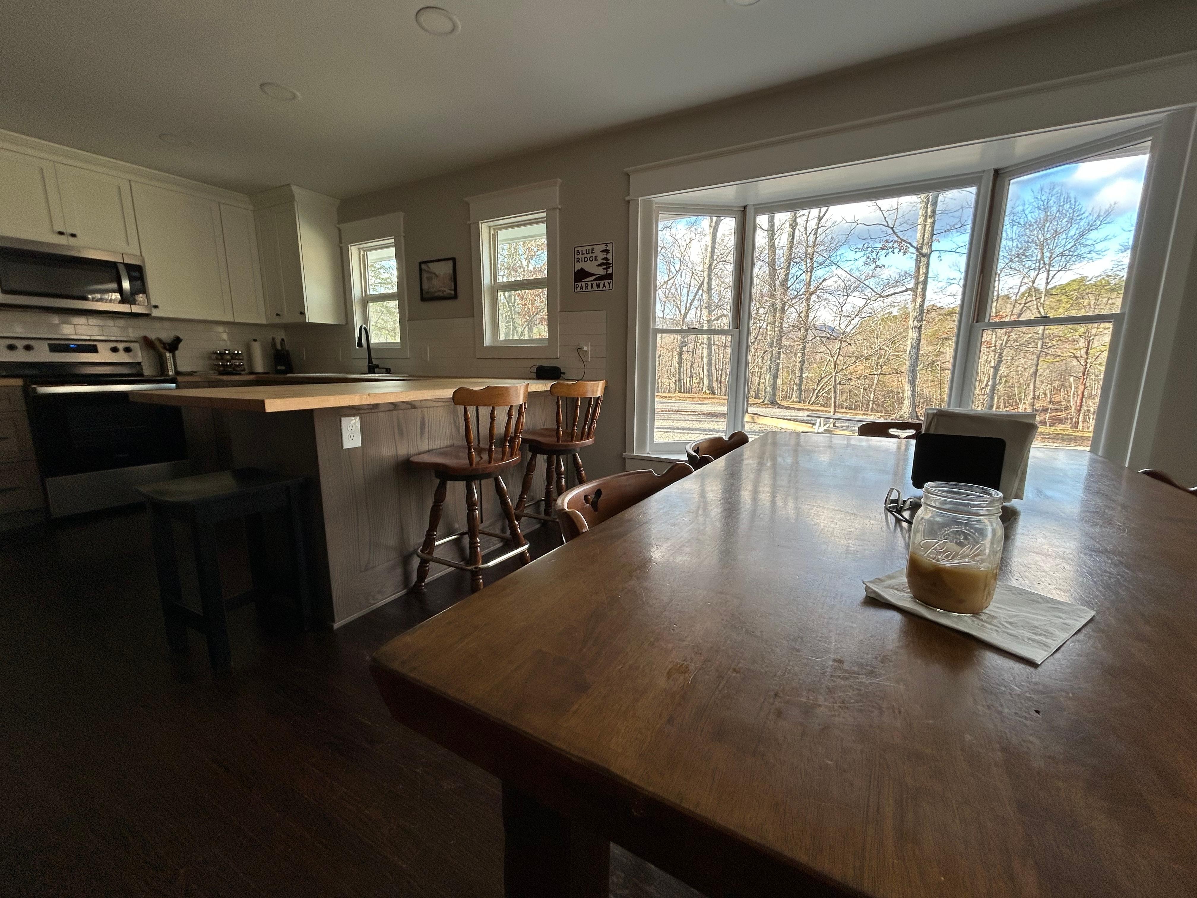 In the kitchen you'll find a full size refrigerator, range, dishwasher, buther block countertops and plenty of cabinet and counter space, including a coffee bar with a coffee grinder for that morning brew. The solid dining room table seats 6 comfortably and is also a great place to set up your laptop. You'll have beautiful views through the bay window into the backyard as well as views of the Blue Ridge Parkway.