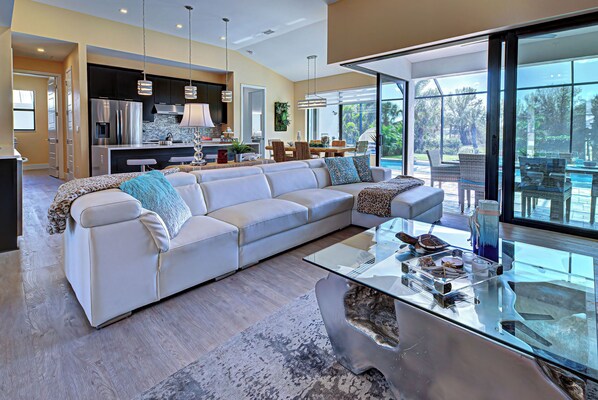 Formal dining with retro wood root dining set for 6 is just steps away with open views to pool area and the large backyard. Entertain with ease as the flow out to the lanai has 3 stacking sliders on one side and a 90 degree slider on the other so you can bring the outside in. Large 260 SFT covered lanai with privacy wall is the perfect space for outdoor entertaining and relaxing. There are 2 ceiling fans, an outdoor dining set, a comfy lounge and four sun loungers and a Tiki Bar as Highlight. You will also enjoy the poolside navy blue outdoor daybed with canopy, large pool with rectangular Sunshelf, Italian glass tiles, outdoor shower embedded in oversized paver deck reaching across the whole width of the house. Being south facing, the deck gets the sun all day.