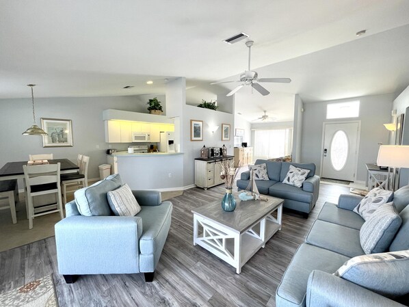 The Great Room har en stue med glidebrytere til Lanai-området, hiet / leseområdet, kjøkkenet og spisestuen. Hovedsoverommet har en king size-seng med fransk dør ut til bassengområdet og eget bad med dusjkabinett og boblebad i marmor. Soverom 2 har også en king size-seng, og det er eget dusjrom med dør ut til bassengområdet. Soverom 3 har enkeltsenger. Familie-badet har dusj over badekaret. Alle badene har hårføner. Hjemmet har kabel-tv i det store rommet og soverommet; telefon og internettilgang. Det fullt utstyrte kjøkkenet har oppvaskmaskin og mikrobølgeovn, og vaskerommet har en vaskemaskin og tørketrommel. Alt sengetøy, håndklær og bassenghåndklær er inkludert.