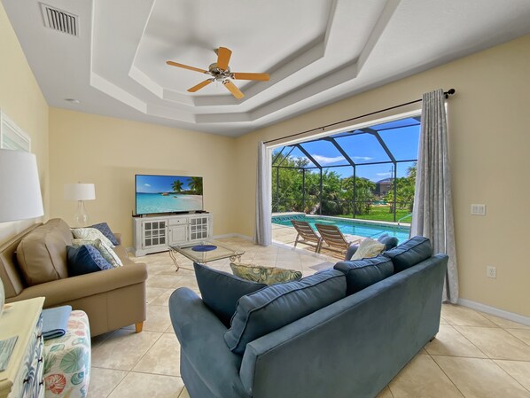 The large open concept living area has 1 sofa and 1 love seat that seats 5, a 50" smart HD TV, a formal dining area that seats 8 You can extend your living space out via the sliding glass doors to the large, screened lanai and pool area; soon to be your favorite room!