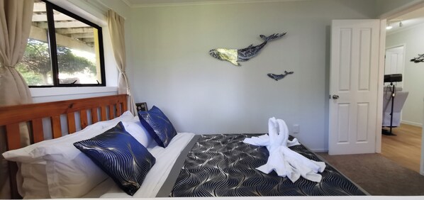 Bedroom 1 featuring the deep blue vibe has a queen-sized bed and comfortable bed linens.