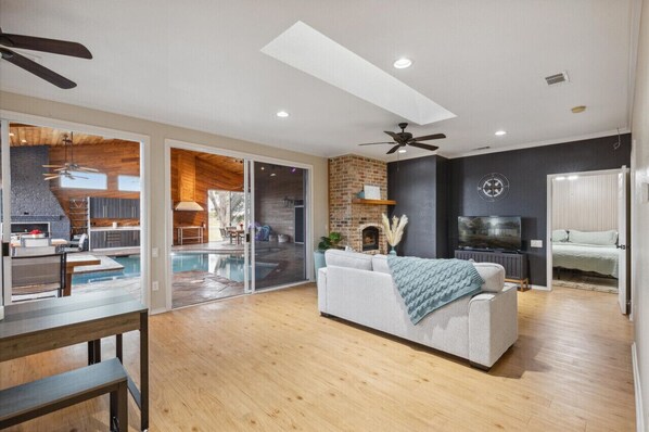 Rockwall Ranch is a sprawling 5-acre estate perfect for groups & gatherings! 6,000 sqft of luxury living space with finely crafted finishes and high-end amenities are sure to impress in this 7-BD/5.5-BA home. From the indoor Texas-shaped heated pool to an inviting fire pit area & private attached guest home, every inch of our pet-friendly property is designed to create unforgettable experiences for up to 18 overnight guests. Plus, we are 15 minutes to Rockwall & the lake and within walking distance from “The Pearl at Sabine Creek” wedding venue.