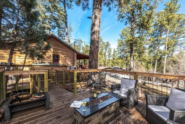 Large Deck with sitting area to enjoy the cool mountain breeze and gas grill, hot tub, and fire pit.
