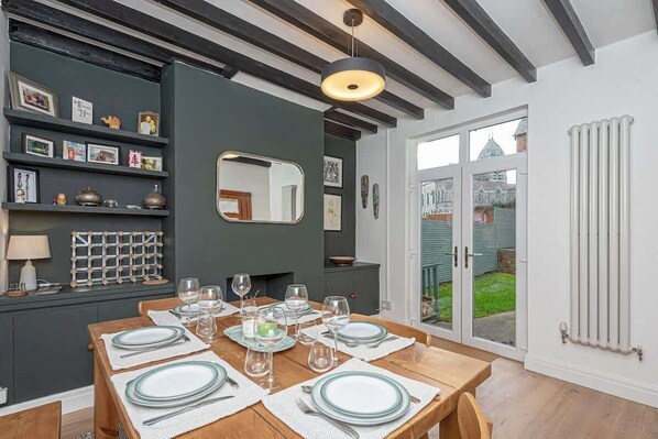 You enter the property through the gated front garden of this beautiful Victorian red brick terraced house and in through the front door. This leads to a cool, light, tiled hallway, with the stairway to the three double bedrooms ahead. Either side of this hallway sit the lounge and the dining area. The lounge has been sumptuously decorated in a navy colour, echoing the grandeur of the traditional Victorian lounge. Two sofas and a chair face the chimney breast, with a modern wood-burning stove providing heat. The Smart TV sits on a cabinet in front of the coffee table, and a large bay window provides light in the day, and large lamps provide a cosy glow at night.