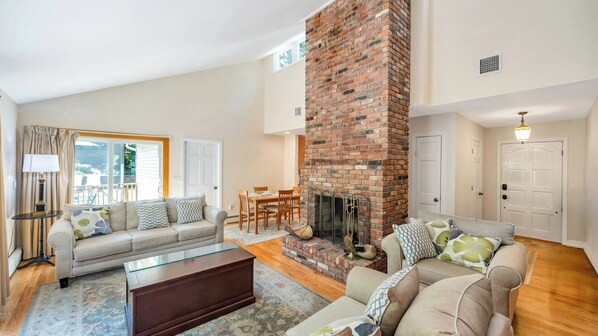 Inside, the home exudes warmth, comfort, and livability. An open-concept floor plan and abundant natural light create an airy, welcoming environment. Guests can move easily between the living room, dining area, and kitchen all connected by wide openings and a natural flow that encourages gathering and connection. The heart of the home is the spacious living room, anchored by a large, central brick fireplace, perfect for cozy evenings after a day at the beach. Glass doors lead directly from the common spaces to the deck and backyard, blurring the lines between inside and out.