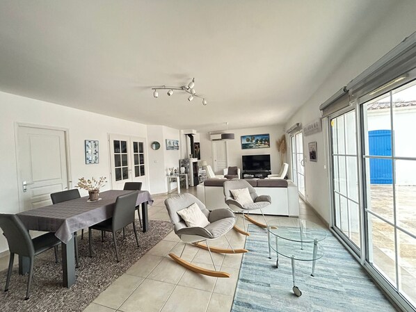 - ENTRANCE: furniture - wardrobe -- - LIVING ROOM: access to large terrace and swimming pool - table - chairs - flat-screen orange TV - sofa - armchairs - furniture - coffee table -- - FULLY EQUIPPED KITCHEN: sink - American-style fridge/freezer - 4 induction hobs - oven - microwave - dishwasher - cupboards - table - chairs - filter coffee maker -- BEDROOM 1 (master suite): access to terrace - 1 double bed (160cm) - bedside tables + lamps - flat-screen TV - chest of drawers - wardrobe -- BATHROOM: double vanity unit - walk-in shower -- - BEDROOM 2: 1 double bed (160cm) - bedside tables + lamps - wardrobe -- BEDROOM 3: 1 double bed (160cm) - bedside tables + lamps - wardrobe -- BATHROOM: double vanity unit - corner bath - toilet -- - WC Separate -- - CELLAR: washing machine/dryer -- - CARPORT -- - garden furniture - outdoor lounge - deckchairs - parasols - charcoal barbecue -- - NO PETS ALLOWED