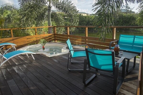 Rød uteterrasse på tre på stylter med sin søppelbøtte (privat basseng) med boblebaddyser (massasjedyser), utesalongen og de to solstolene