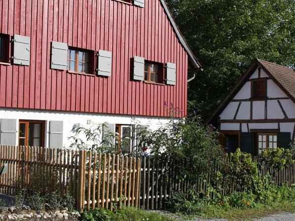 The comfortable vacation apartment with its own entrance and exclusive furnishings in a modern country house style was completed in 2017 and is located on the top floor of a historic half-timbered house in Salem-Altenbeuren. It has a separate bedroom with a double bed with a very good orthopaedic mattress and a living/bedroom with a single bed and a sofa. The new fully equipped kitchen with a cozy handmade corner bench includes a dishwasher, oven, kettle, toaster and Cafissimo capsule machine. The spacious bathroom has a large walk-in shower and a washing machine. Bed linen, towels and tea towels are included in the price. A travel cot and high chair can be provided on request. An electric charging station at the house can charge your car with solar power. There is a garden table and chairs on the sunny guest terrace. The rental period is at least three nights and includes the final cleaning. The tourist tax is included in the rental price. This is a non-smoking apartment and pets are not permitted.
