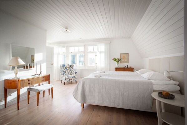 Marjaniemi offers a peaceful stay surrounded by nature, set along a tree-lined road, with a private pier overlooking a lake, a wood-fired sauna cottage, and spacious outdoor areas. Indoors, guests can enjoy bright living spaces with large windows including a reading room with books in multiple languages, a piano, and a vintage-style fireplace. With inviting living spaces and heritage details, Marjaniemi provides a relaxing setting in the heart of Finnish nature.