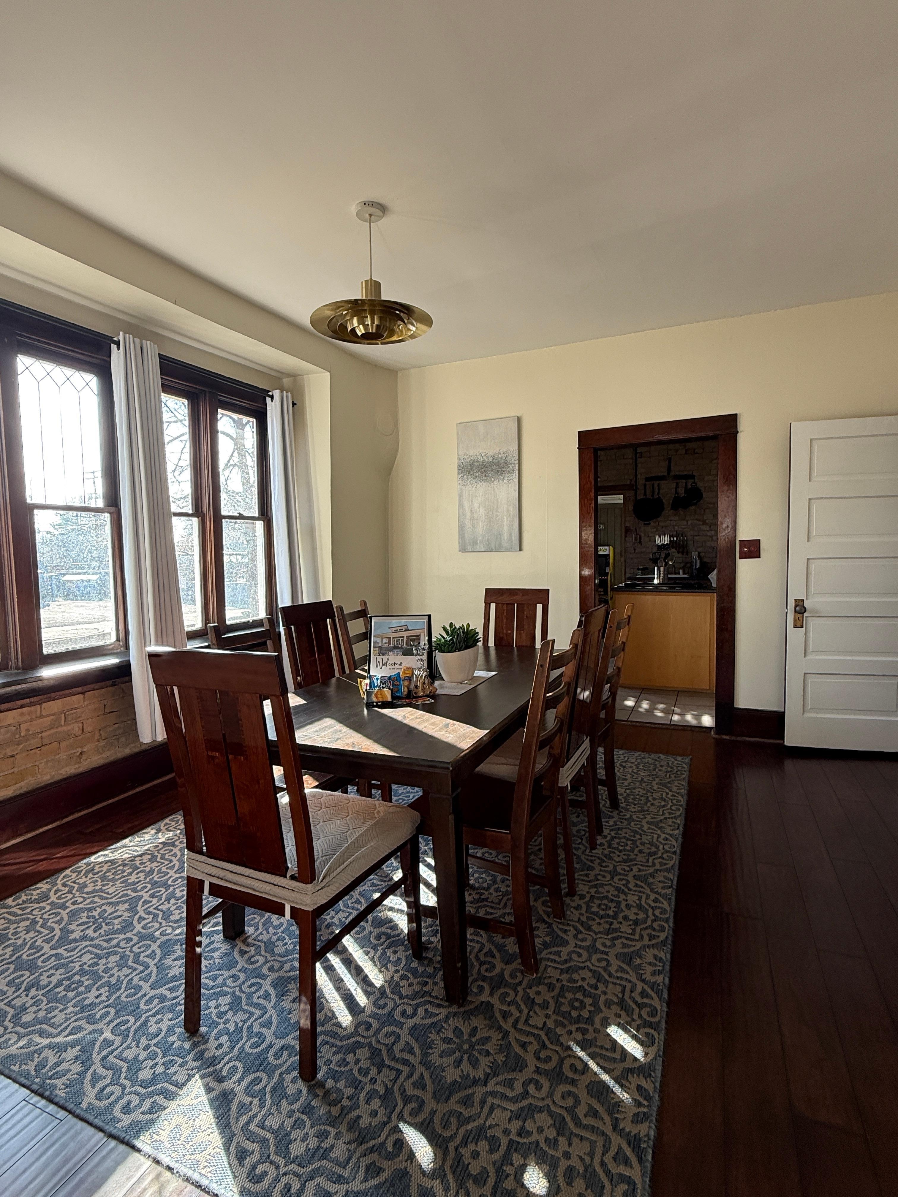 DINING ROOM: Large dining table and seating for 8, filled with natural light, record player with records, and barware.