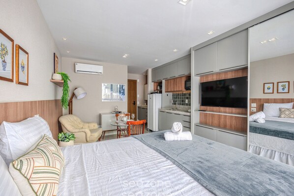 Quarto completo, confortável, portaria 24h, segurança e boa localização. Excelente!