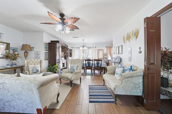 The home offers comfortable sleeping arrangements with a queen bed in the first bedroom, full beds in the second and third bedrooms, and two twin beds in the fourth bedroom. You’ll have everything you need for a relaxing stay, including Smart TV, books, board games, a dining table, ceiling fans, and a grill for outdoor meals. The kitchen is stocked with a refrigerator, stove and oven, dishwasher, dishware, flatware, cooking basics, a drip coffee maker, and a microwave.