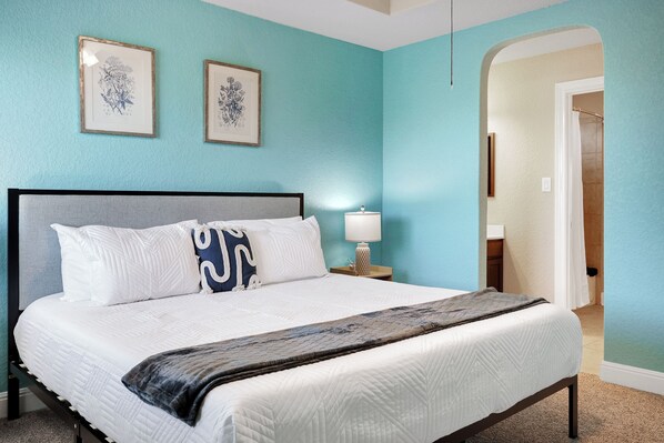 • Third bedroom: Second floor, king-sized bed, smart TV, bedside table + lamp, walk-in closet + ensuite bathroom