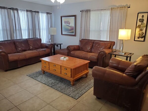 ✦ Three Well-Appointed Bedrooms: Each bedroom is a sanctuary of rest and relaxation. The primary bedroom is furnished with a king, while the second offers a queen and two twin beds, and the third a cozy queen bed, accommodating up to 9 guests with ease.